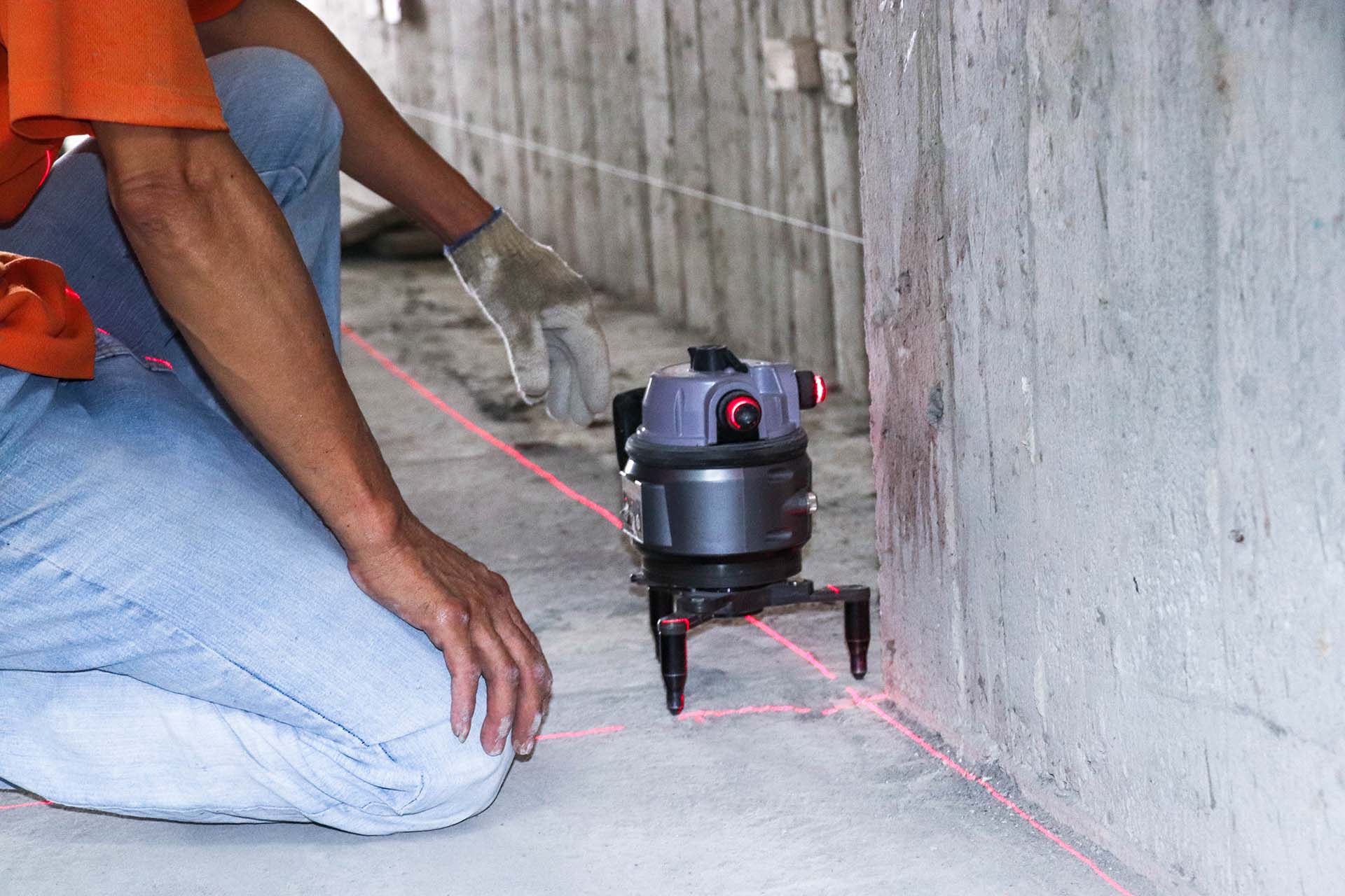 1.首先使用雷射水平儀在牆面及地面打出光束垂直水平線, 依牆面尺寸將尼龍線綁在釘子拉出垂直面、水平面、厚度的基準線作為放樣▼