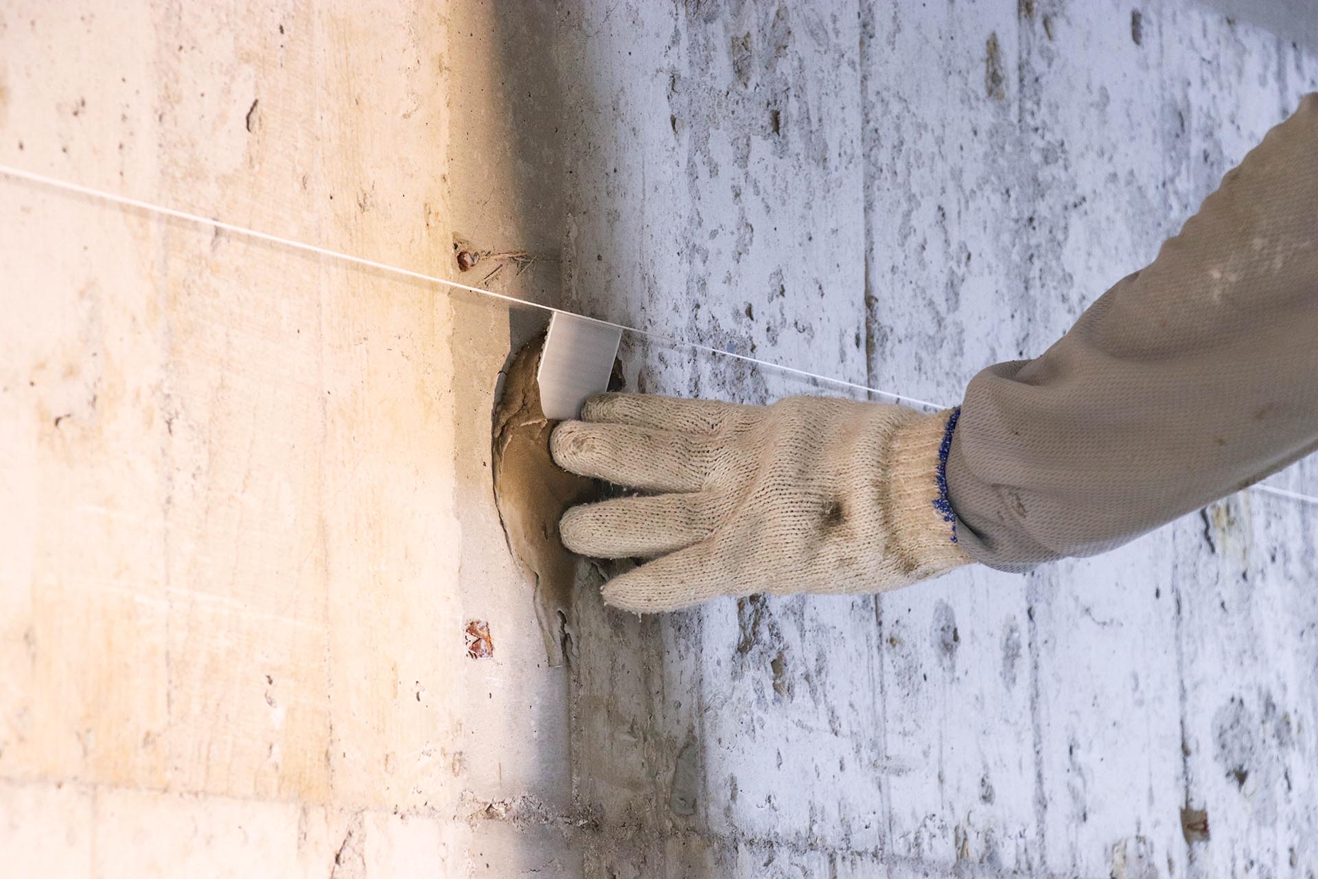 4.用縵刀將調製好的水泥砂漿抹在牆面上,厚度需要蓋過灰誌, 接者用抹平尺將牆面多餘的水泥砂漿刮除整平,保持牆面厚度一致▼